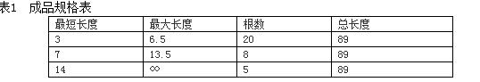 原料按长度分档,通常以0.5米为一档,如:3-3.4米按3米计算,3.5米-3.9米按3.5米计算,其余的依此类推。表1是几种常 见成品的规格,长度单位为米,∞表示没有上限,但实际长度小于26米。